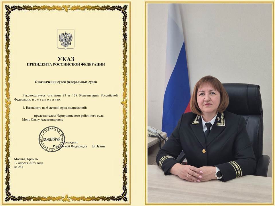 Указом Президента Российской Федерации № 244 от 17 апреля 2025 г. Мень Ольга Александровна назначена на должность председателя Чернушинского районного суда Пермского края |